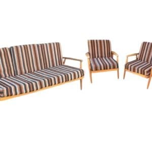 THB1059 three piece suite American / UK – blonde ribbed Airborne Upholstery three seat sofa and two arm chairs