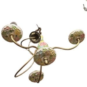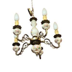 Thb14848 chandelier brass and ceramic with floral decor – cream candle covers over brass bulb holders – 5 branch x 1