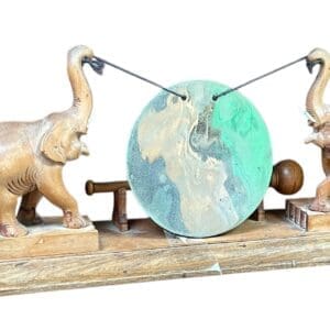 THB13596 dinner Gong hardwood base two elephants either side of metal disk gong with wooden ball end hammer