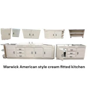 THB2635 Warwick fitted kitchen cream metal with black d handles American style with louvered top trim to base units vertical ribbed end curved panels to base and one double wall cupboard