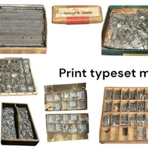 THB13465 Print press type set metal small assorted letters / numbers / punctuation and typeset (1940s -1990s)