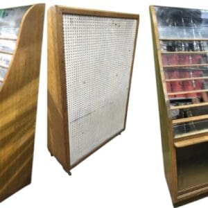 THB4535 shop display stand beech with mirrored shelving sections for cards / stockings mirrored to back of each sections pegboard to back of each unit painted white (one with drawer base one with glass sliding doors