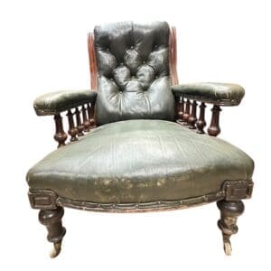 THB4150 library Arm Chair green leather buttoned back stud surround on ceramic castors Victorian x 1