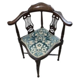 THB4146 Arm Chair corner chair mahogany with padded seat inlaid orbate decor to back ornate harp shape to arms Edwardian x 1