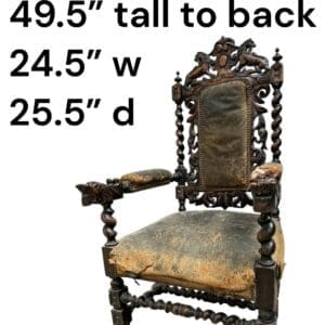 THB15488 (MS) Throne arm chair Victorian heavy carved worn leather seat bank and arm rests x 1