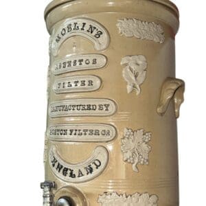 THB13960 Water Filter tan cylindrical stoneware with white ceramic moulding chrome tap with domed lid & knob handle x 1 (Moslin’s Asbestos’s Filter manufactured by Boston Filters CR England)